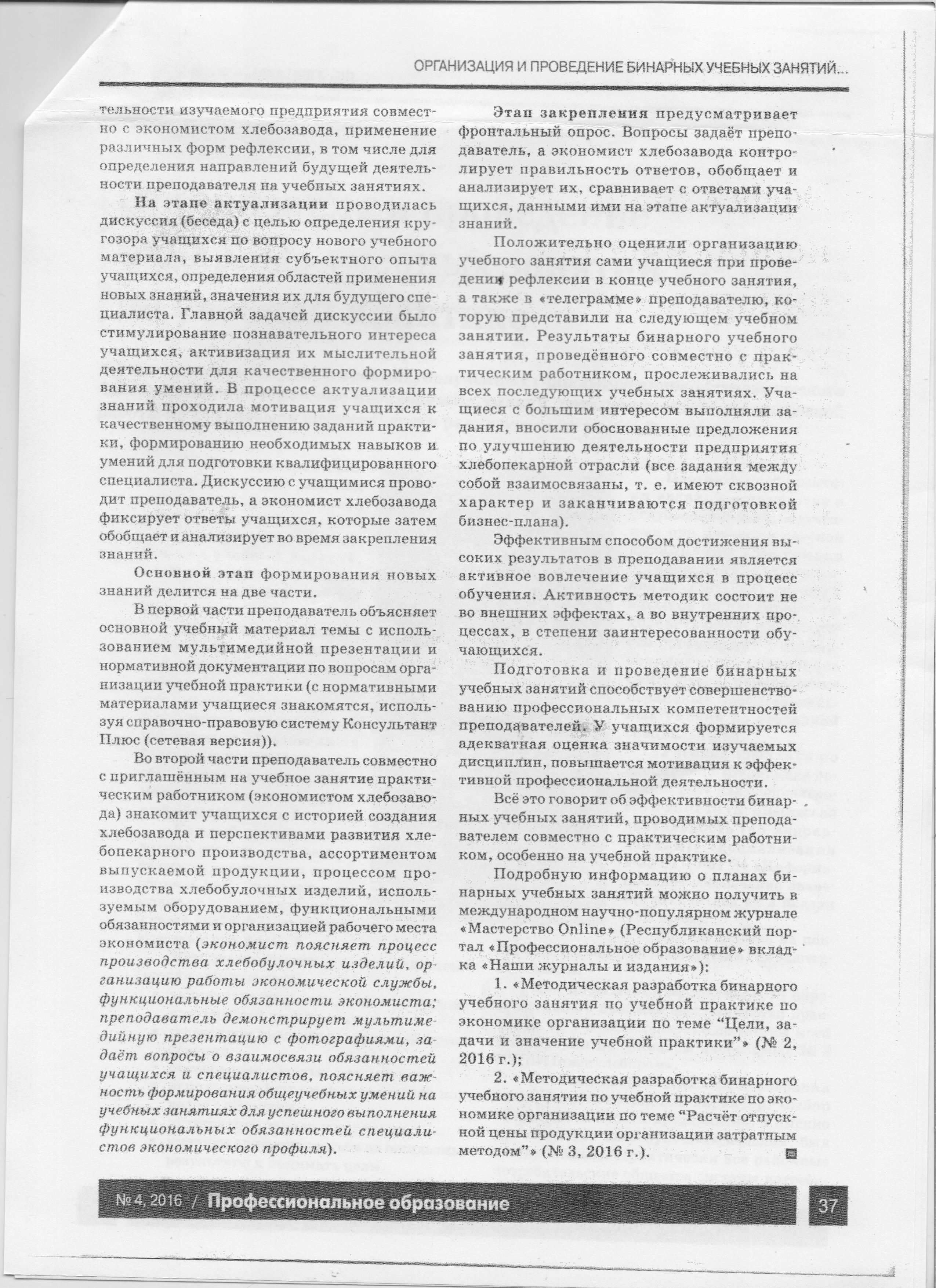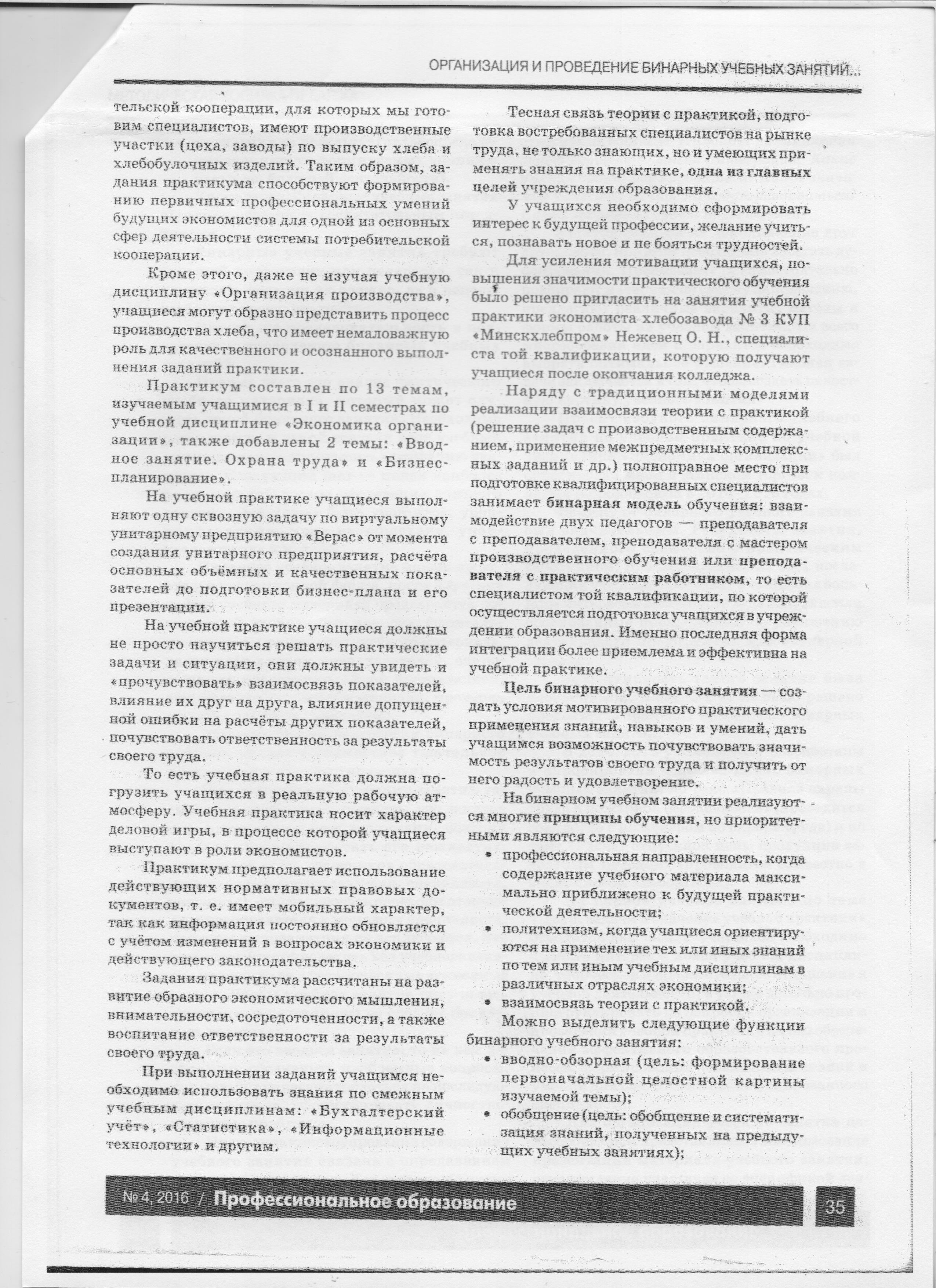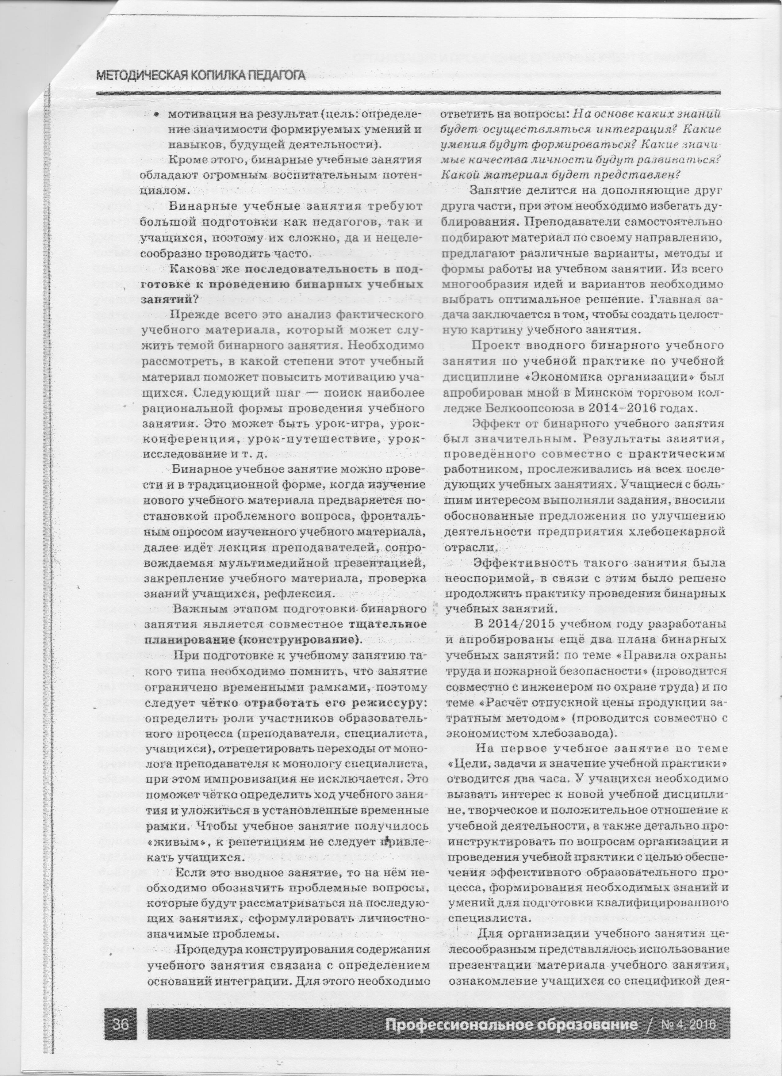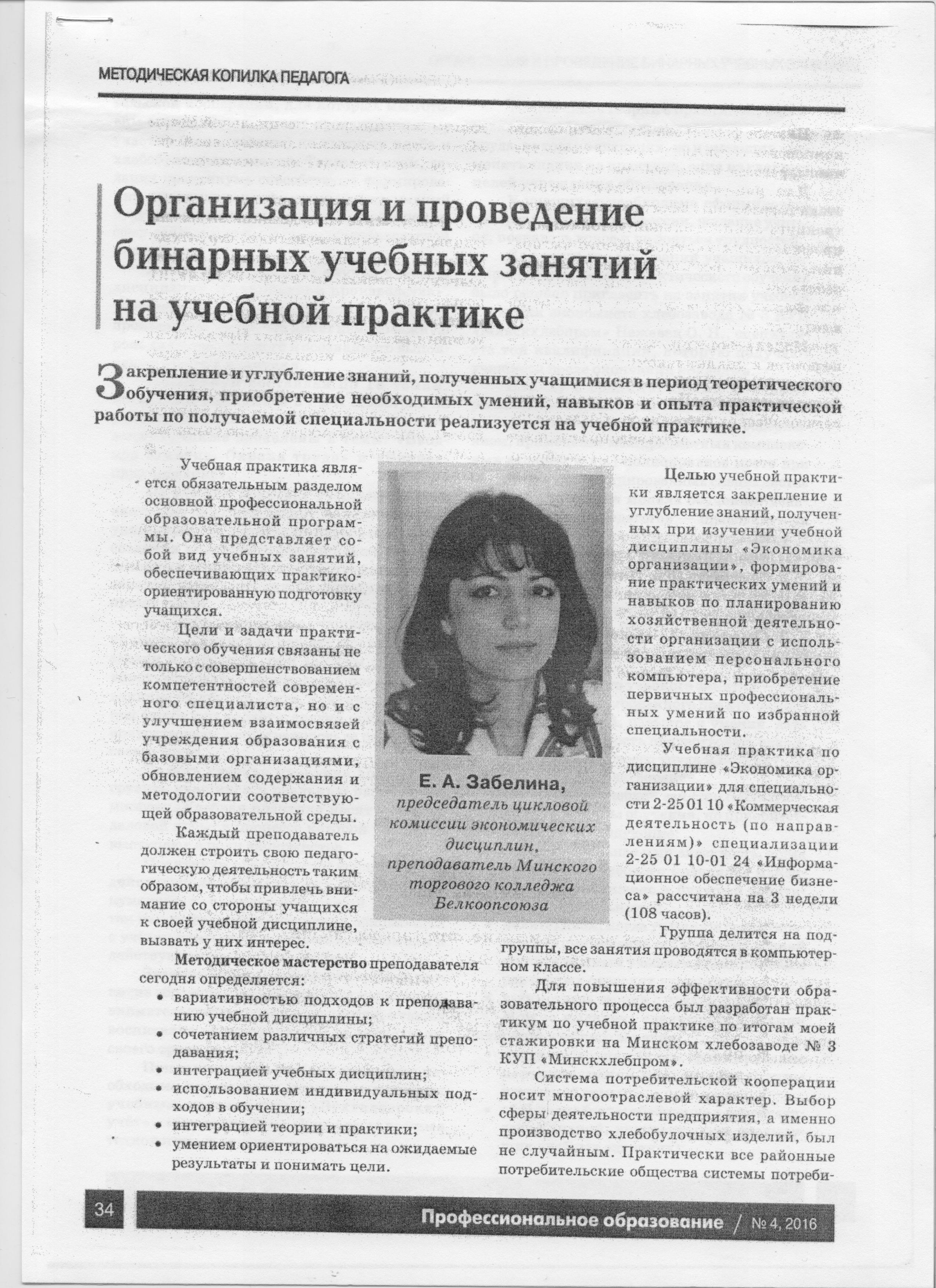 Забелина Е.А. Организация и проведение бинарных занятий на учебной практике. (Журнал "Адукацыя і выхаванне" №4 2016)