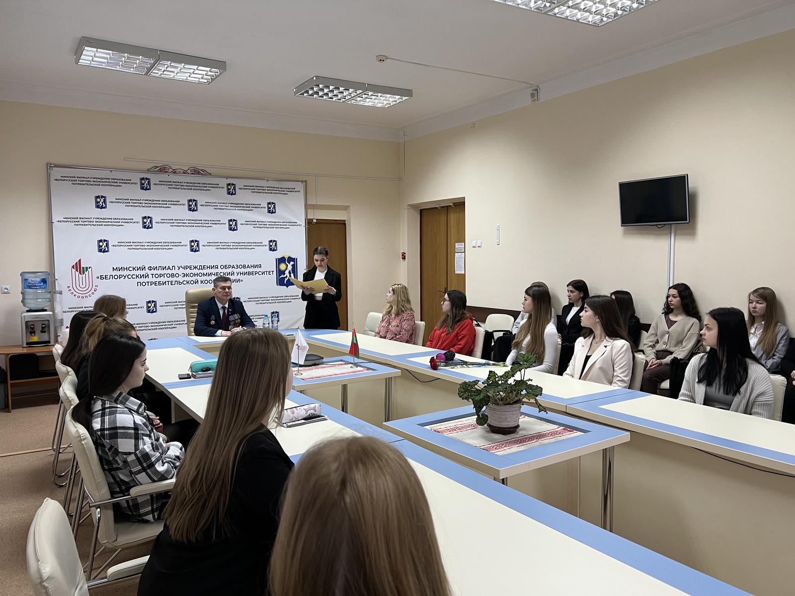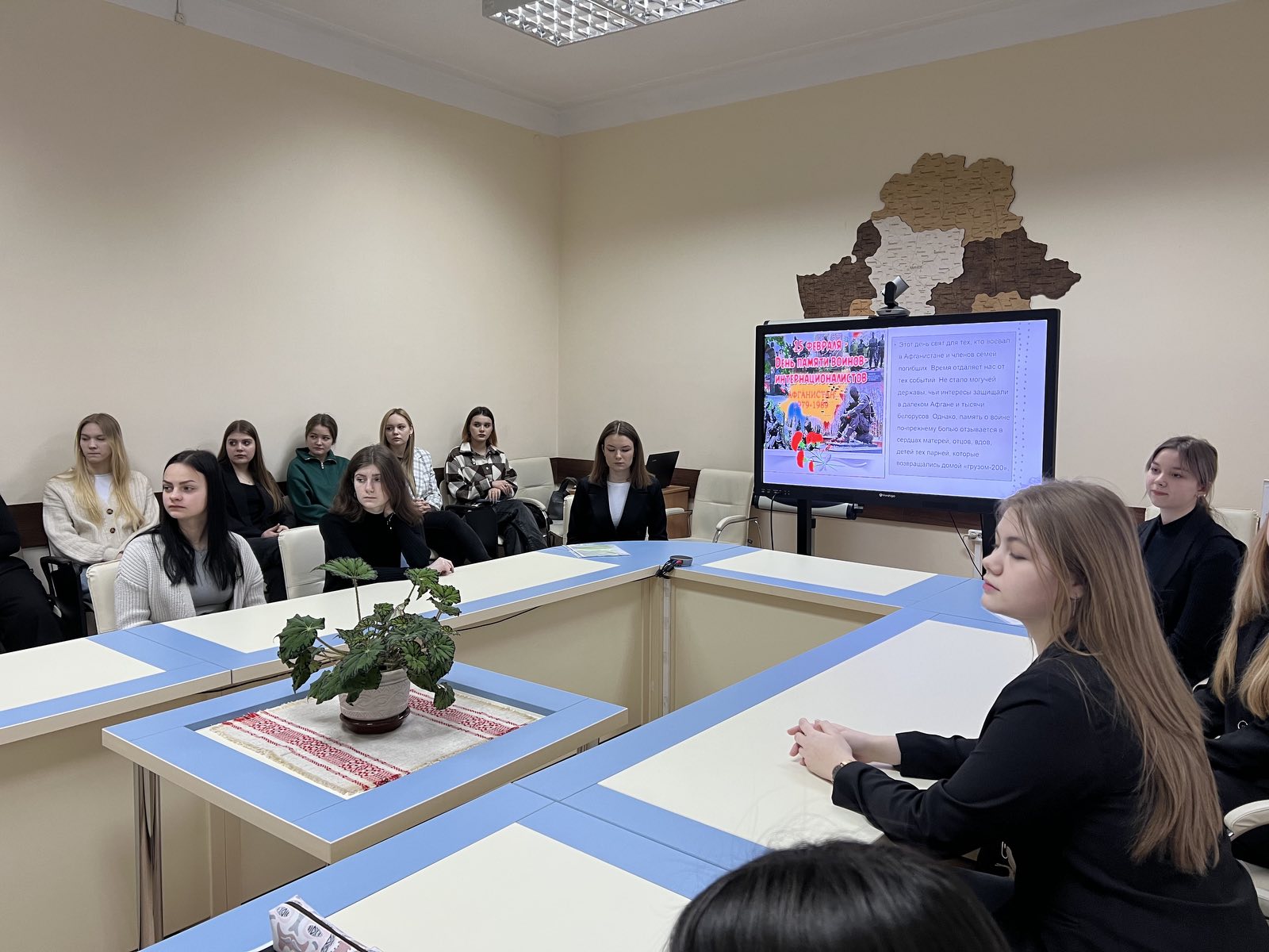 23.02.2023 в Минском филиале секретарь ПО БРСМ Карканица Ирина Геннадьевна и учащиеся группы 21 ПБ провели Урок мужества. Приглашённым гостем стал воин-интернационалист, директор филиала Олег Фёдорович Левшунов.