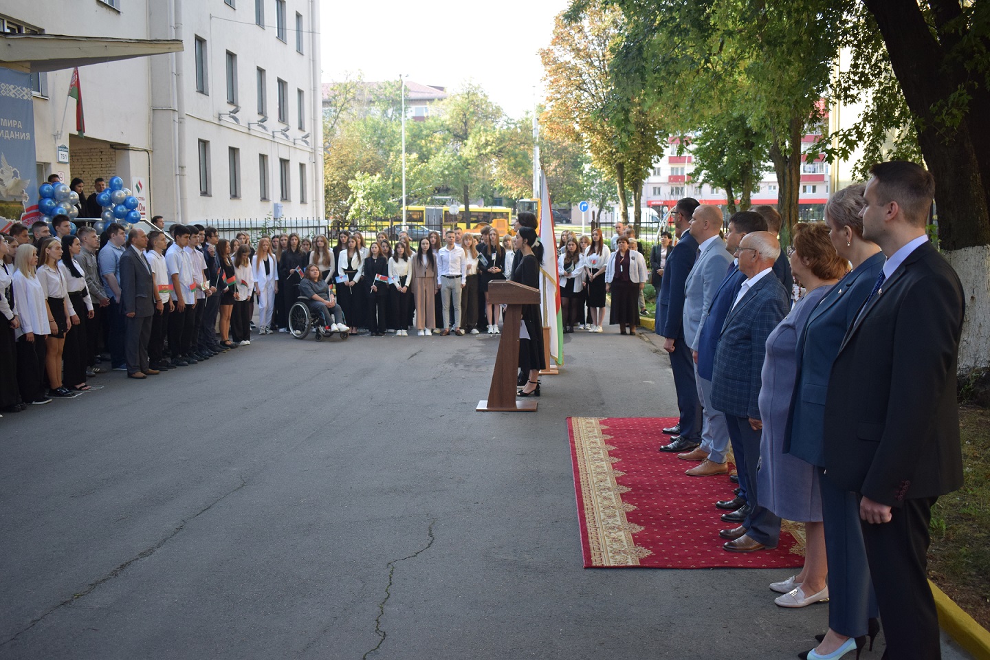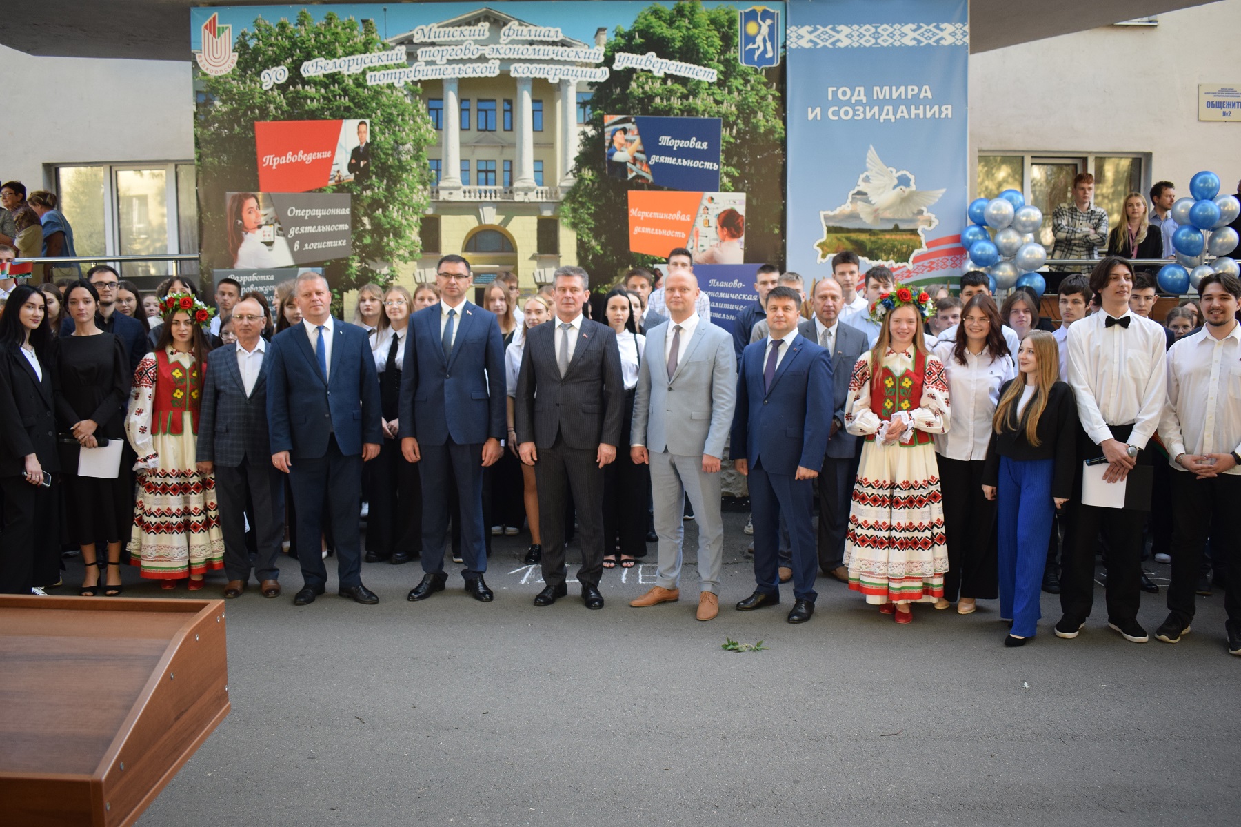 В Минском филиале БТЭУ ПК прошла торжественная линейка, посвященная Дню Знаний. Поздравить первокурсников с новым этапом в их жизни пришли почётные гости - Первый заместитель Председателя Правления БЕЛКООПСОЮЗА Скрундевский Александр Николаевич, Председатель правления Минского областного союза потребительских обществ Дверницкий Вадим Евгеньевич, Председатель Заводского районного г.Минска объединения профсоюзов Денюшкин Сергей Леонидович, Заместитель директора торгового коммунального унитарного предприятия "Универмаг" БЕЛАРУСЬ " Руденко Игорь Владимирович и заслуженный ветеран труда системы потребительской кооперации Комса Владимир Александрович.