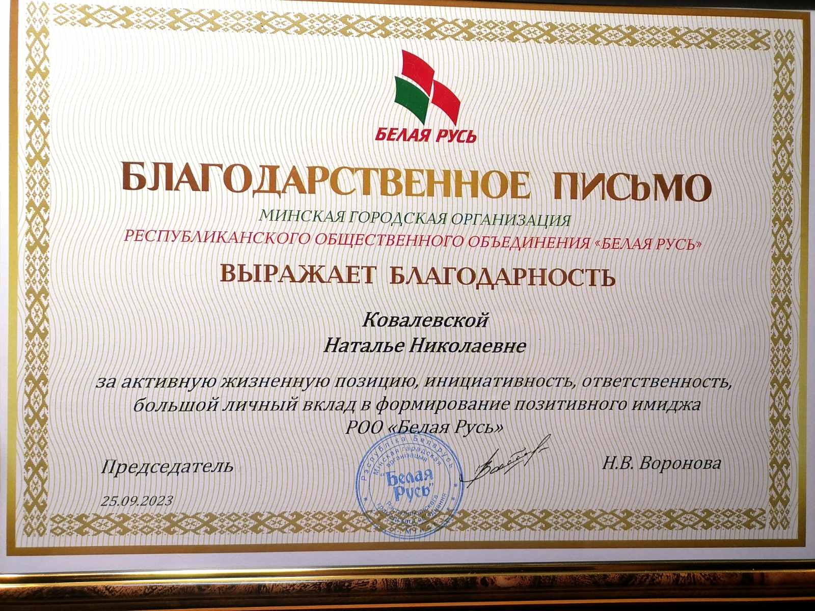 Преподаватель Наталья Ковалевская отмечена Благодарностью за активную деятельность в РОО «Белая Русь»