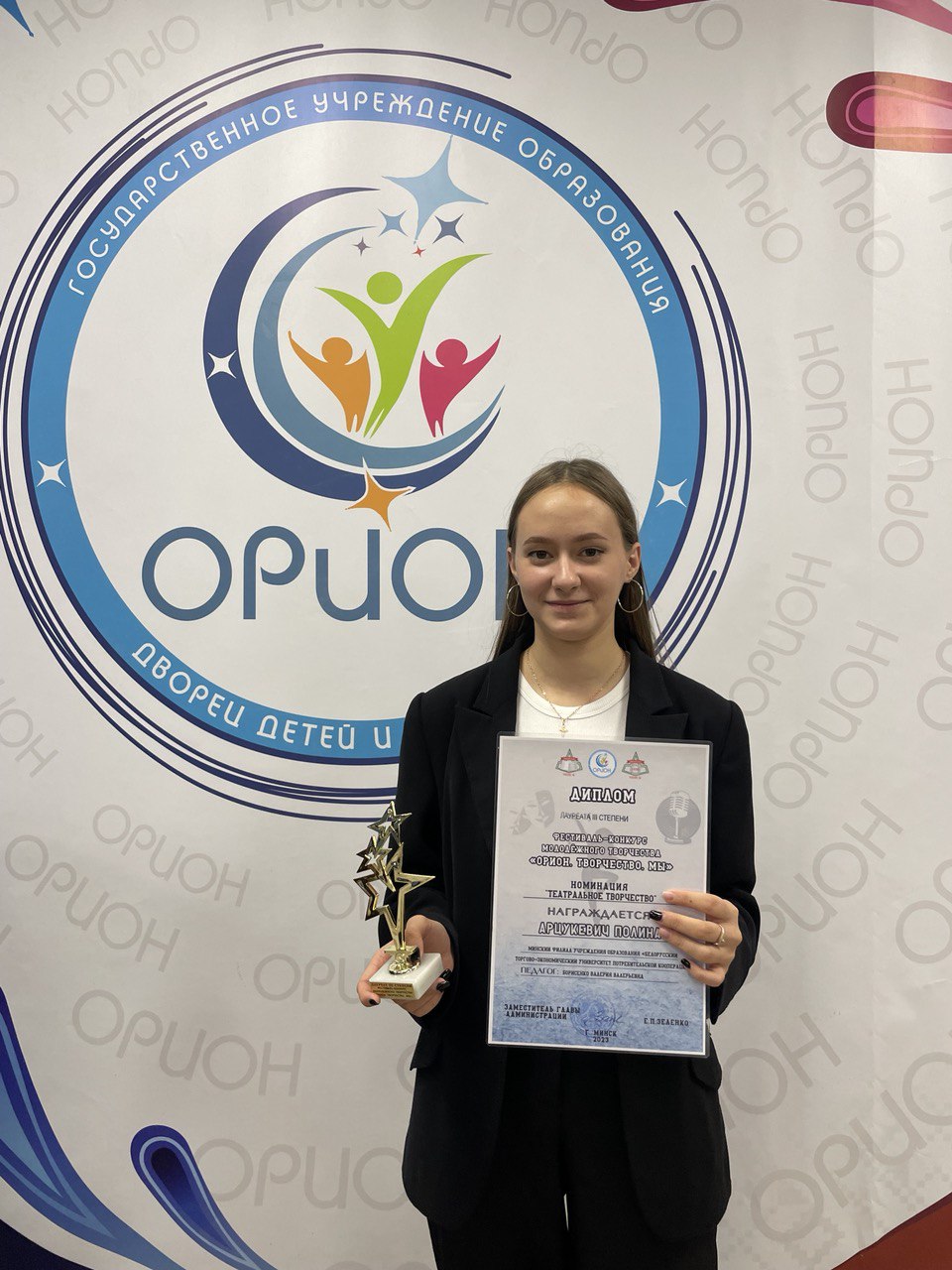 Два дня 22.11.2023 и 23.11.2023 творческий коллектив "Новое Поколение" принимал участие в фестивале-конкурсе молодёжного творчества "ОРИОН.ТВОРЧЕСТВО.МЫ"Результат - Шкуринская Екатерина - Диплом симпатии жюри в номинации "Вокальное творчество (соло)" , Арцукевич Полина - Диплом III степени в номинации "Театральное творчество" и танец "BEGGIN" Диплом III степени в номинации "Хореография". Во время вручения Дипломов дальнейших творческих успехов нашему танцевальному коллективу пожелал член жюри Фёдор Григорьевич Козлов — выпускник клоунской студии при Московском цирке на Цветном бульваре, знаменитый клоун ФЕКО, который работал с ведущими мастерами цирка - Ю.В.Никулиным и О.К.Поповым.