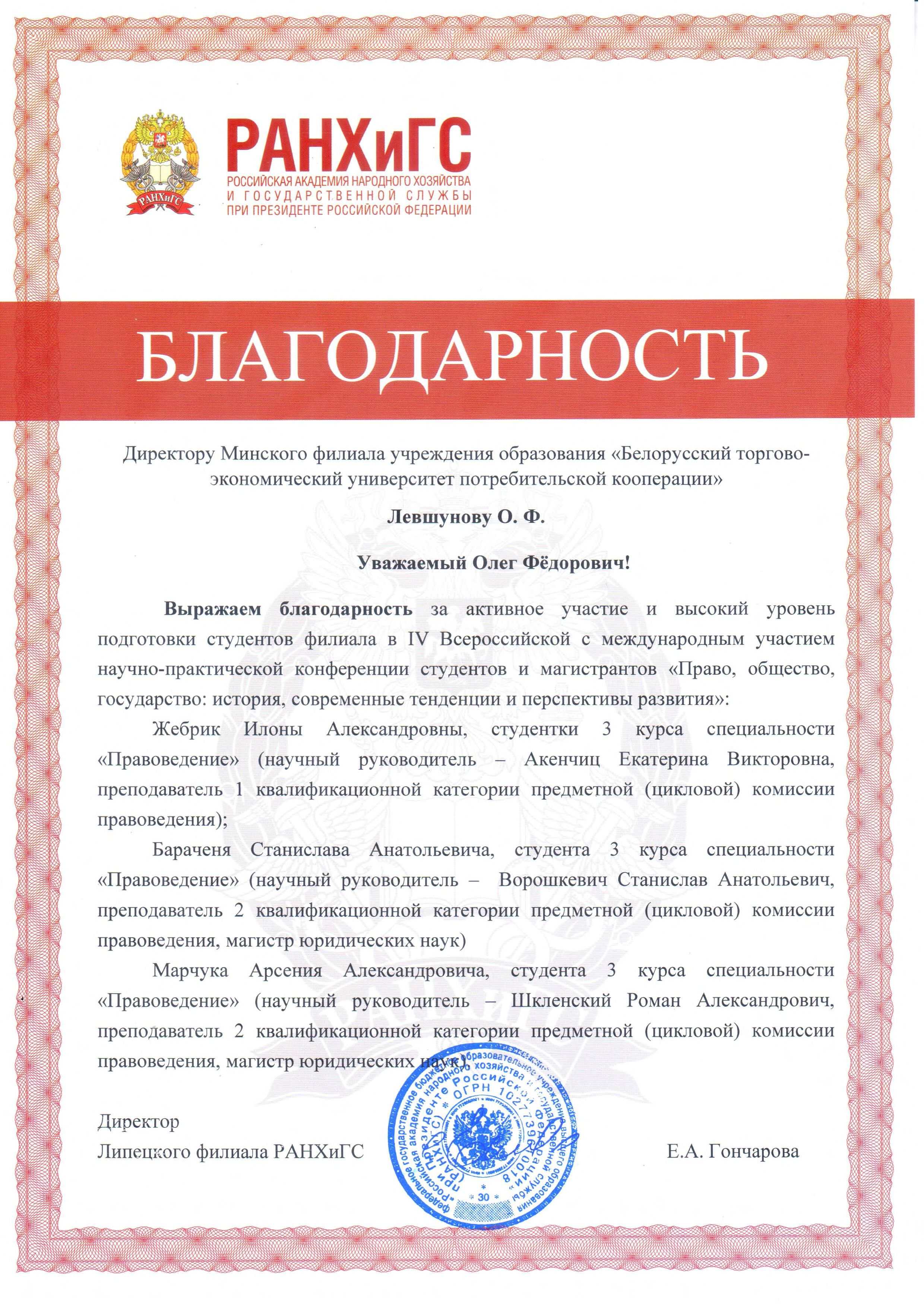 По итогам IV Всероссийской с международным участием научно-практической конференции студентов и магистрантов «Право, общество, государство: история, современные тенденции и перспективы развития» участники и научные руководители Минского филиала получили благодарственное письмо за активное участие и высокую степень научности статей. Конференция проводилась совместно с Российской академией народного хозяйства и государственной службы при Президенте Российской Федерации.