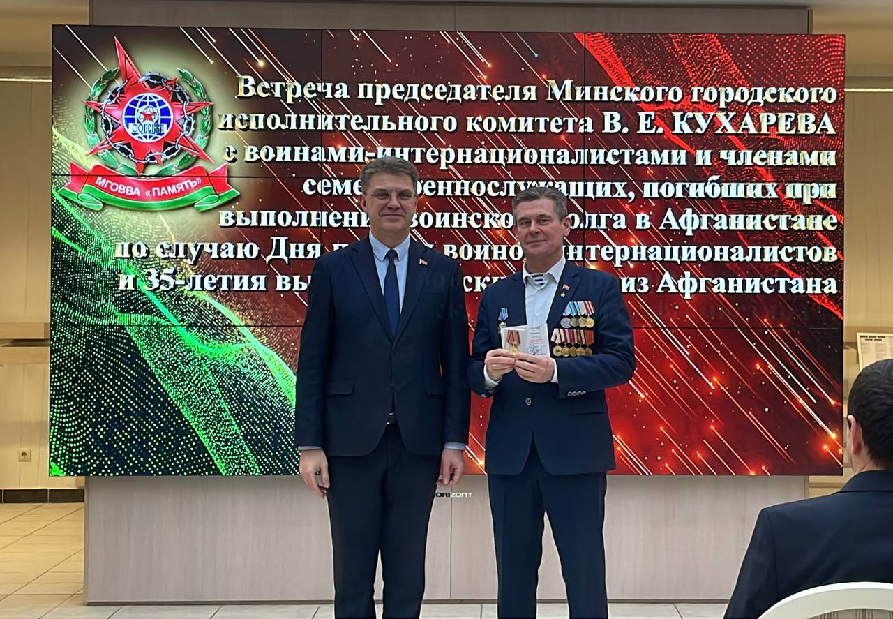 В канун 35-летия вывода советских войск из Афганистана, в Минской городской ратуше прошла знаковая встреча председателя Мингорисполкома Кухарева Владимира Евгеньевича с воинами-интернационалистами и членами семей военнослужащих, погибших при выполнении воинского долга в Афганистане. В ходе данной встречи директор Минского филиала УО БТЭУ ПК Левшунов Олег Федорович был награждён медалью «35 лет вывода советских войск из Афганистана». Работники и учащиеся Минского филиала поздравляют Олега Федоровича с получением заслуженной награды, которая является прямым подтверждением высоких личностных качеств!