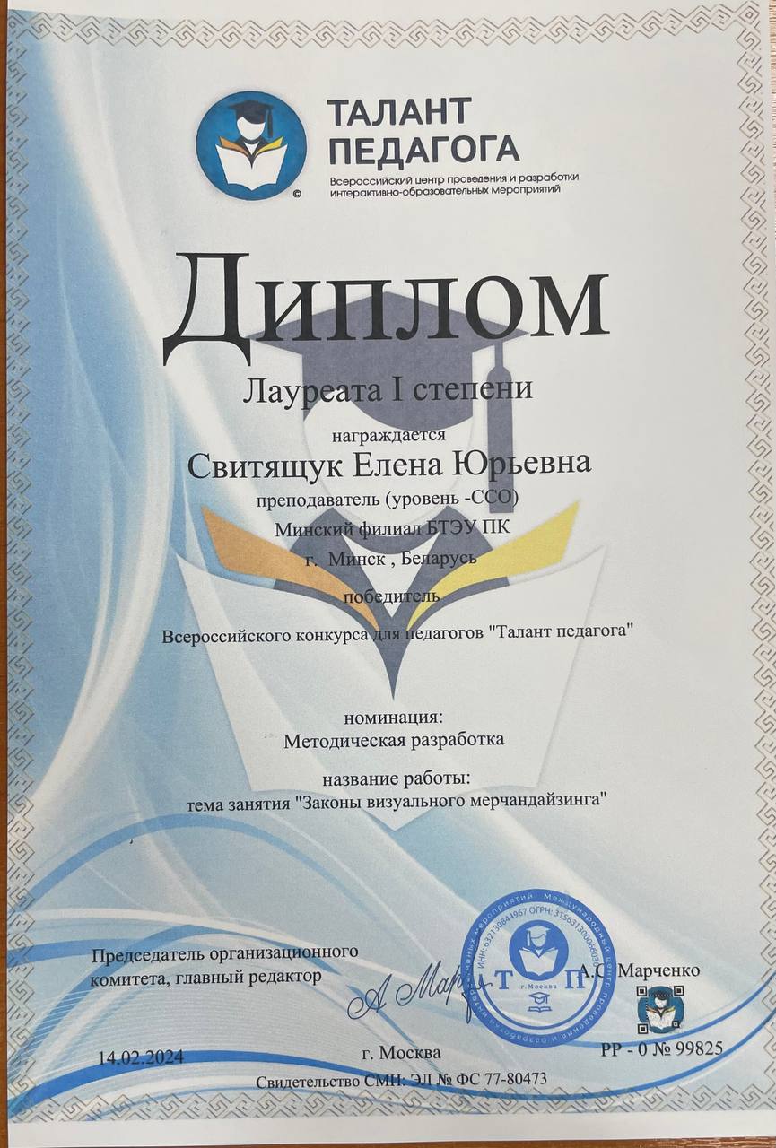 Преподаватель Минского филиала БТЭУ ПК Свитящук Елена Юрьевна приняла участие в международном конкурсе для педагогов «Талант педагога» в номинации «Методическая разработка» на тему «Законы визуального мерчандайзинга» и стала Лауреатом I степени! От всей души поздравляем и желаем здоровья, радости и новых творческих успехов!