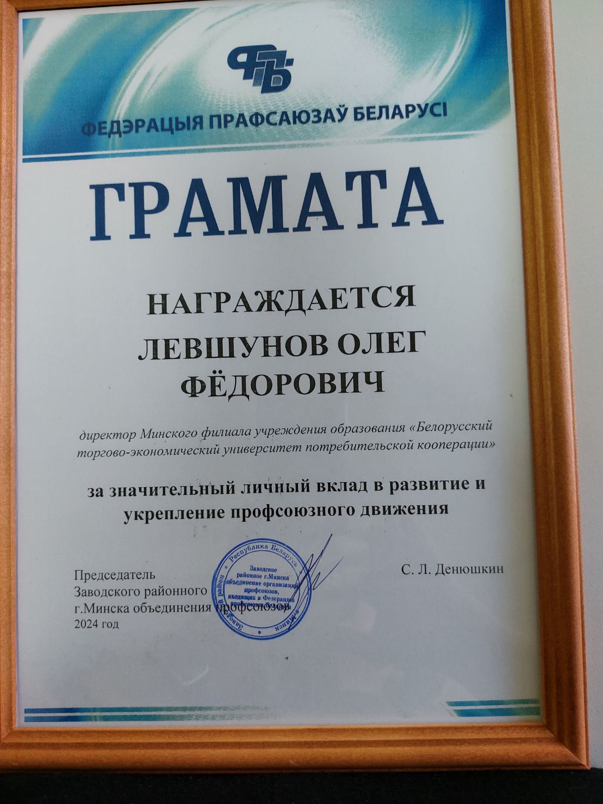 Директор филиала Левшунов Олег Федорович был награжден грамотой за значительный личный вклад в развитие и укрепление профсоюзного движения.