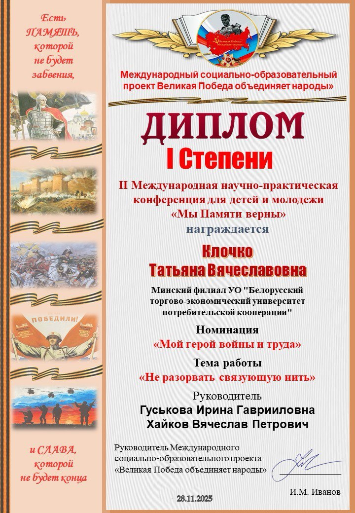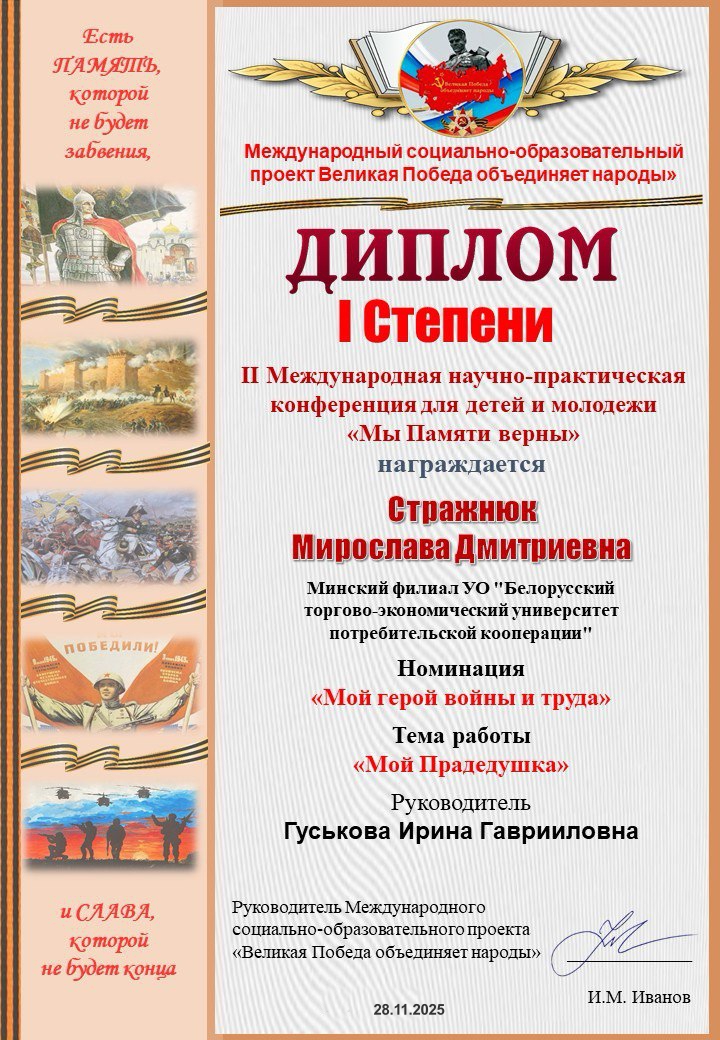 По приглашению Заводской районной организации РОО «Белая Русь» в работе конференции приняли участие Клочко Татьяна Вячеславовна (гр.31ПБ) и Стражнюк Мирослава Дмитриевна (гр.22ПБ). Учащиеся нашего Филиала представили видеодоклады «Не разорвать связующую нить» (руководители Гуськова И.Г., Хайков В.П.) и «Мой прадедушка» (руководитель Гуськова И.Г.), которые получили высокую оценку экспертов конференции и в номинации «Мой герой войны и труда» отмечены дипломами I степени.