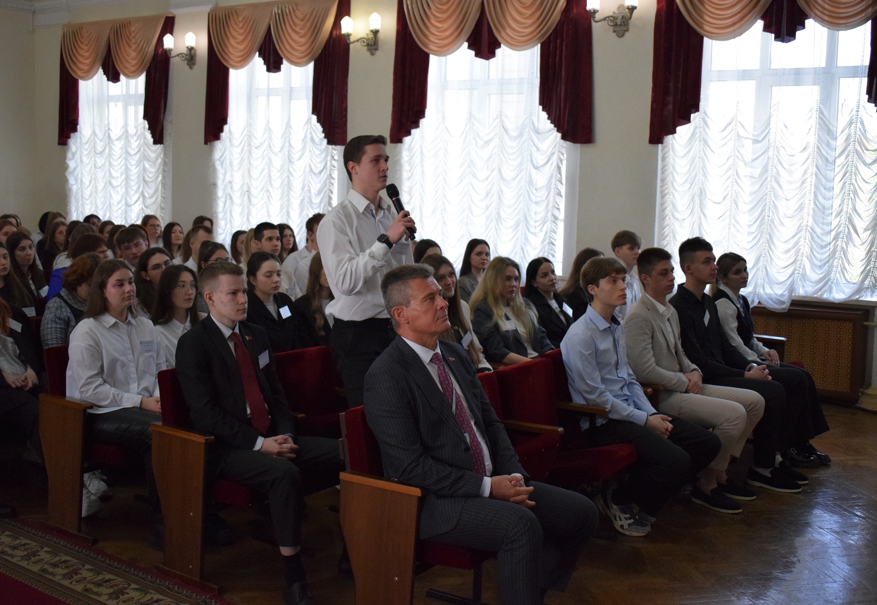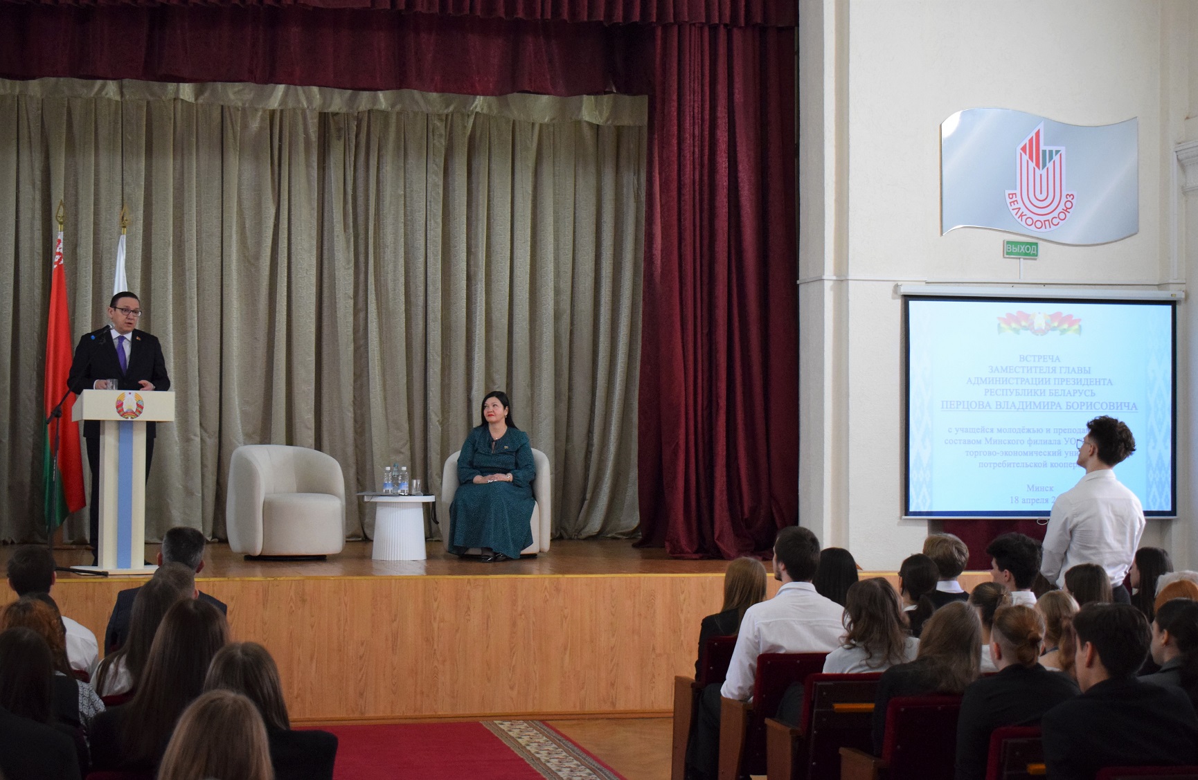 18 апреля заместитель главы Администрации Президента Владимир Перцов провел встречу с учащейся молодежью и преподавательским составом Минского филиала УО "Белорусский торгово-экономический университет потребительской кооперации". И у учащихся, и у преподавателей была возможность задать заместителю главы Администрации Президента любые интересующие их вопросы. Встреча не ограничивалась какой-либо конкретной тематикой: учащиеся спрашивали Владимира Перцова про 80-летие Победы советского народа в Великой Отечественной войне, противостояние информационным вызовам и угрозам, молодежную политику и воспитание. Был и вопрос о том, как можно стать сотрудником Администрации Президента.