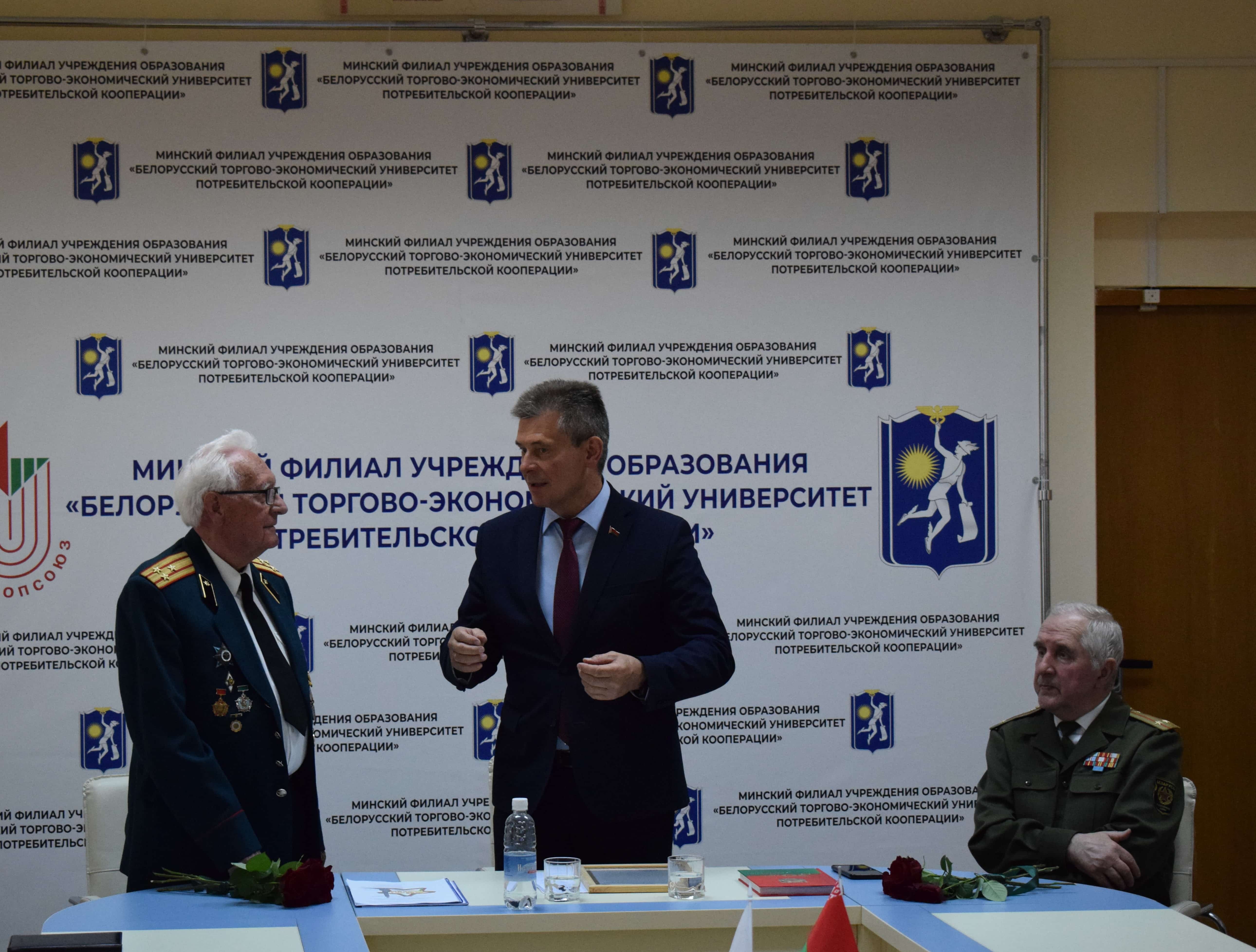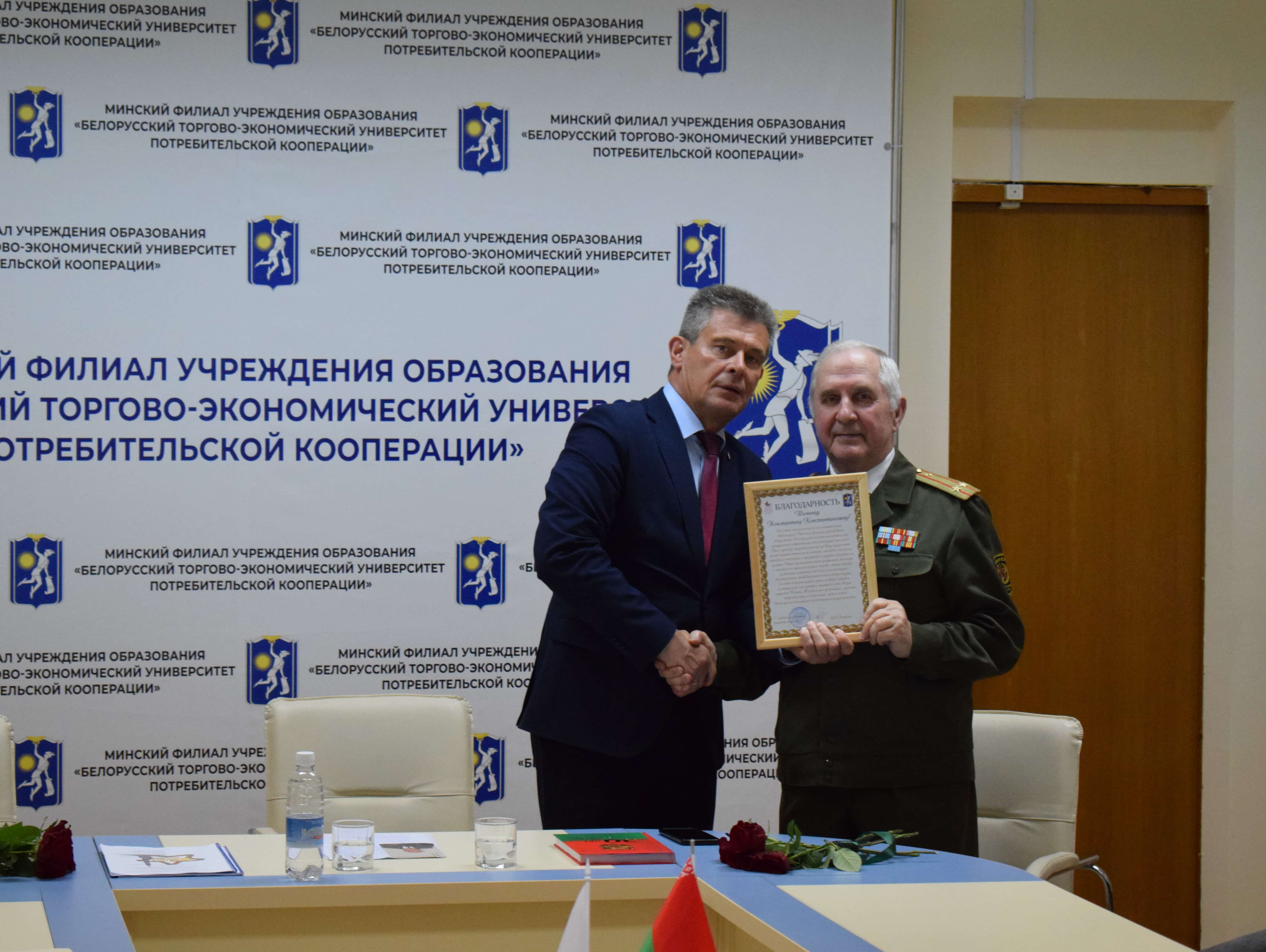 Директор филиала Левшунов Олег Федорович поблагодарил ветеранов Вооруженных Сил, отметив, что граждане нашей страны вот уже 80 лет живут под мирным небом, и, от имени педагогического коллектива, вручил Константину Константиновичу Благодарность за активное участие в жизни учреждения образования, бережное отношение к традициям и защите исторической памяти.