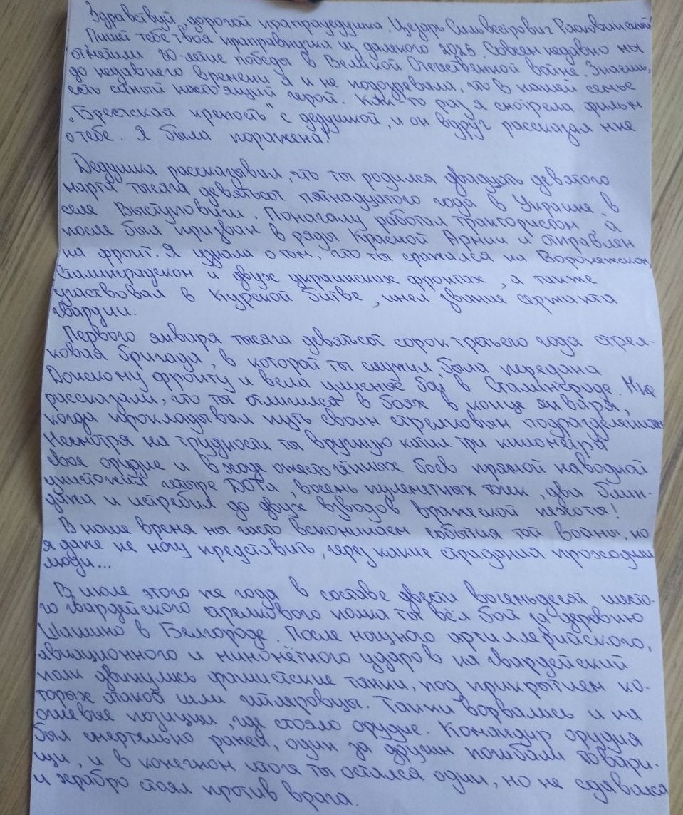 В предварительном этапе приняли участие все желающие. Задание было написать письмо прадеду или прабабушке, которые были участниками Великой Отечественной войны, либо тружениками тыла. Послание могло быть в форме письма-благодарности, сочинения-размышления о значении подвига, вложенного труда конкретного человека в победу советского народа в войне и в последующее послевоенное восстановление страны. В результате на республиканский этап конкурса отправлены письма: прадеду Харловскому Семену Иосифовичу учащейся 11 ЛБ группы Харловской Виктории; прадеду Расковинскому Цезарю Сильвестровичу, Герою Советского Союза, учащейся 12 ПБ группы Сафоновой Виалеты; прадеду Ходюкову Терентию Петровичу учащейся 11 ТБ группы Фиранчук Виктории.