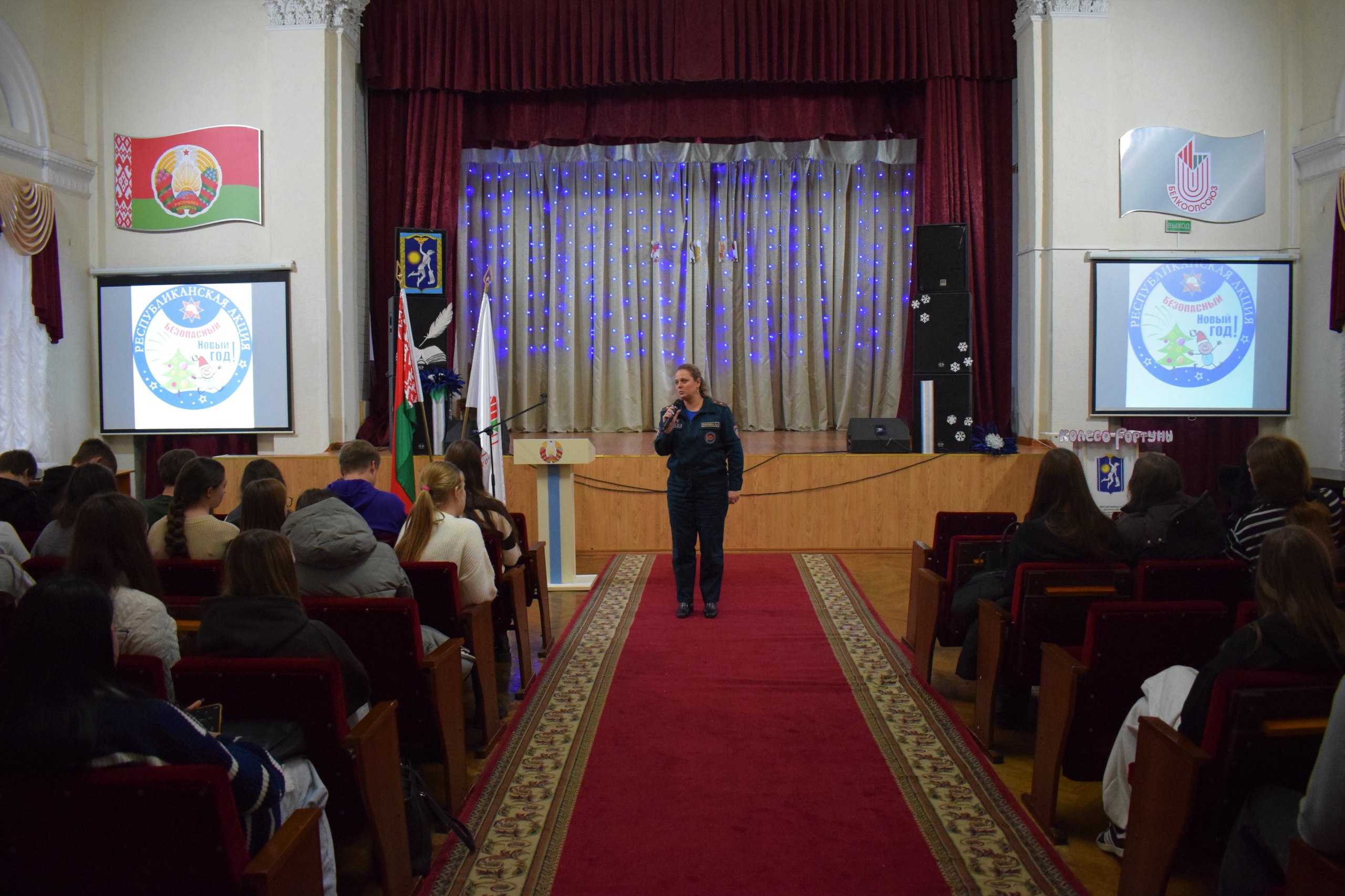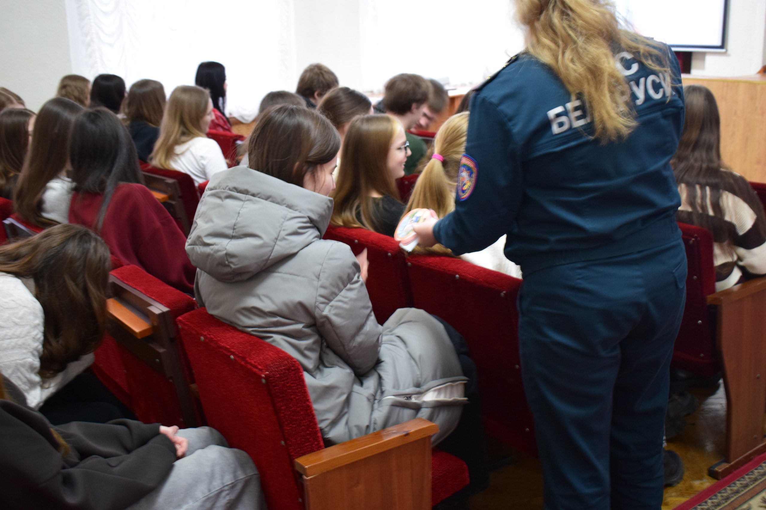 В рамках проводимой республиканской акции «Безопасный Новый год!» инспектор Заводского районного отдела по чрезвычайным ситуациям Курочкина А.А. 18 декабря 2025 года встретилась с обучающимися первого и второго курса Минского филиала УО «Белорусский торгово-экономический университет потребительской кооперации».
