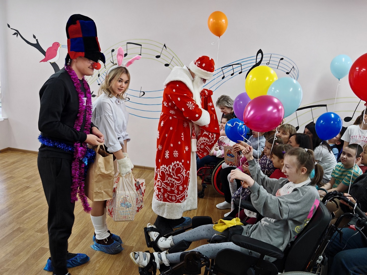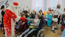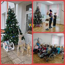 Дед Мороз и Снегурочка, Зайка, Кошка Лера и Скоморох провели представление с интерактивными конкурсами, играми и традиционным новогодним хороводом. Воспитанники центра были искренне рады представлению, общению, играм и сладким призам, собранным коллективом сотрудников и обучающихся Филиала в рамках Новогоднего марафона добрых дел, традиционно проводимого в декабре. В Центр также были переданы канцелярские товары, влажные салфетки, массажные масла, пеленки и проч.