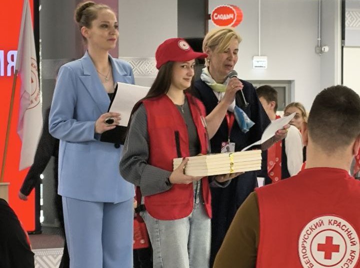 Учащиеся учебной группы 21ЭБ, волонтёры Красного Креста, Амельянович Полина, Бондарева Ольга, Селиванова Маргарита, Радкевич Екатерина и Арцукевич Полина приняли участие в торжественной церемонии принятия в волонтёры Минской городской организации Белорусского Красного Креста.