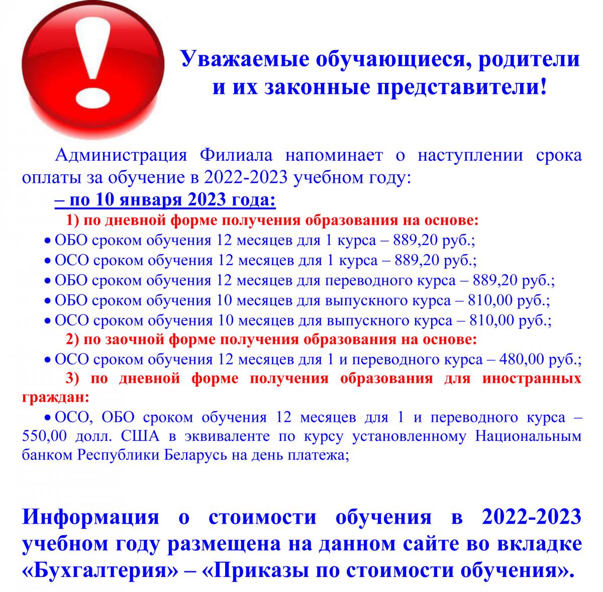 Оплата за обучение в 2022-2023 учебном году