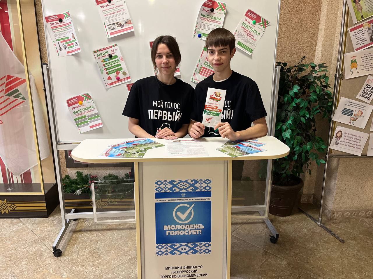 Волонтеры Минского филиала «БТЭУ ПК» помогают в рамках республиканской акции для впервые голосующих граждан «ТВОЙ ГОЛОС ПЕРВЫЙ». Тем, кто уже достиг совершеннолетия, вручают эксклюзивные подарки от БРСМ – брендированные футболки с названием акции.