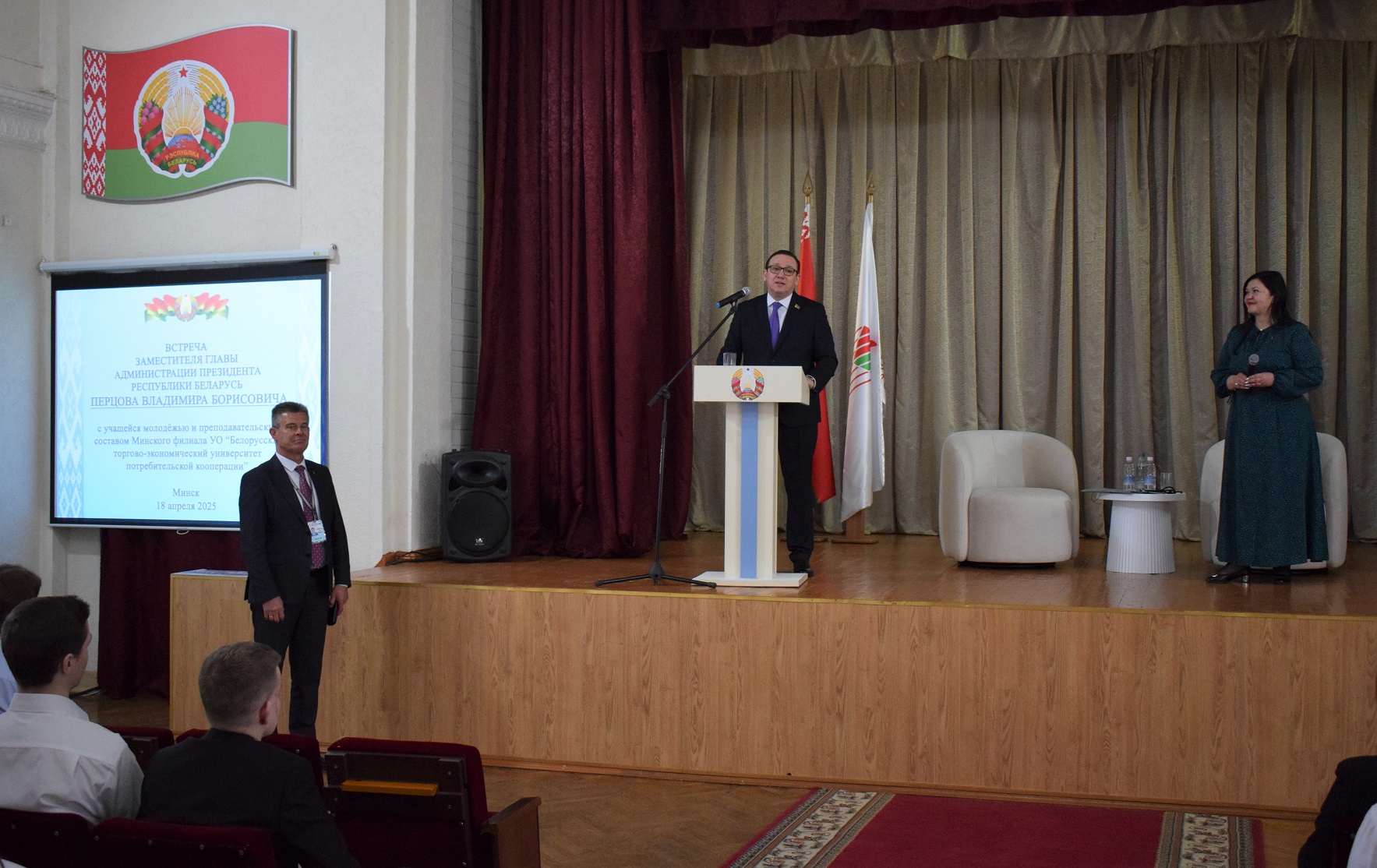 18 апреля заместитель главы Администрации Президента Владимир Перцов провел встречу с учащейся молодежью и преподавательским составом Минского филиала УО "Белорусский торгово-экономический университет потребительской кооперации". И у учащихся, и у преподавателей была возможность задать заместителю главы Администрации Президента любые интересующие их вопросы. Встреча не ограничивалась какой-либо конкретной тематикой: учащиеся спрашивали Владимира Перцова про 80-летие Победы советского народа в Великой Отечественной войне, противостояние информационным вызовам и угрозам, молодежную политику и воспитание. Был и вопрос о том, как можно стать сотрудником Администрации Президента.