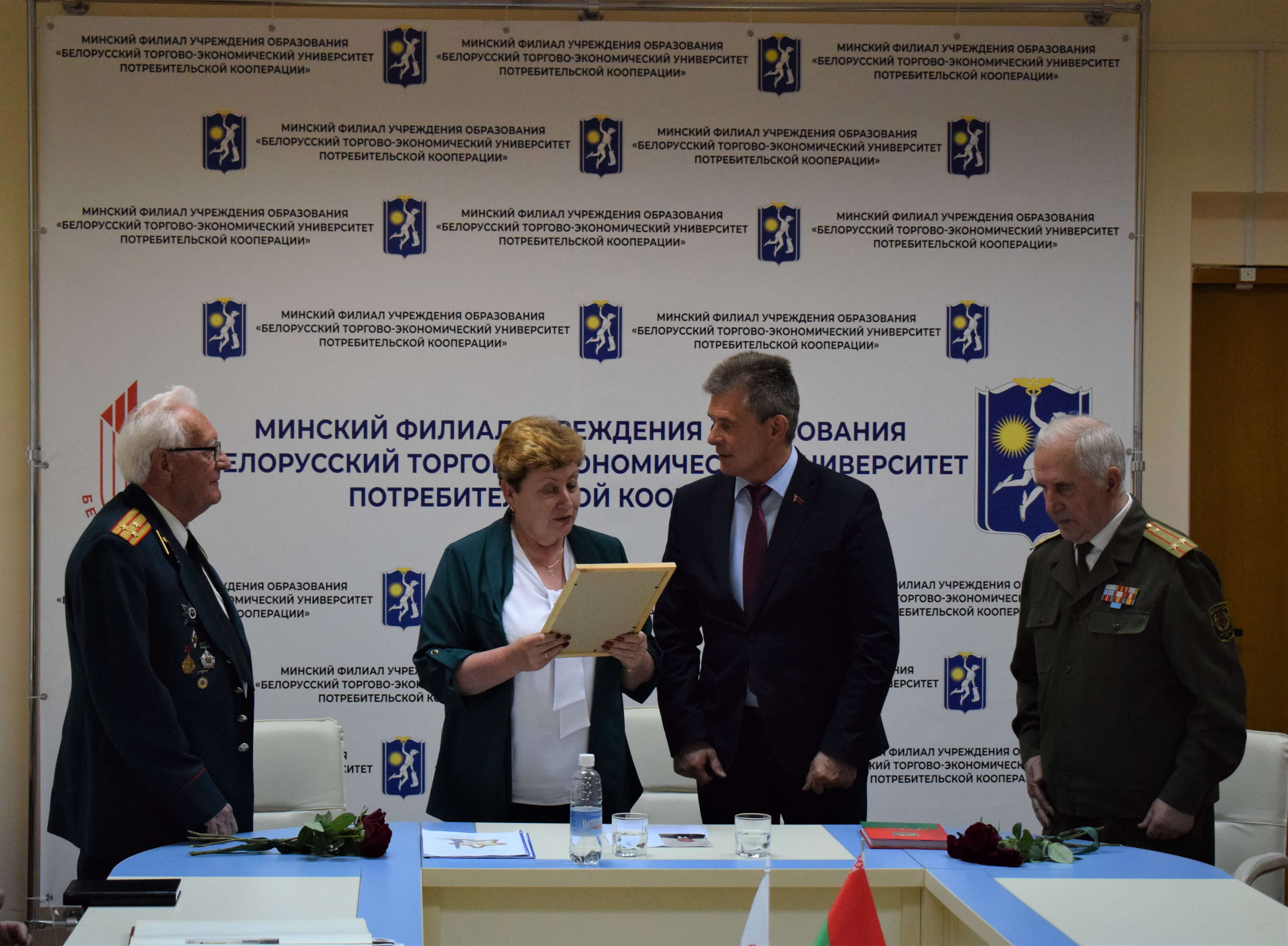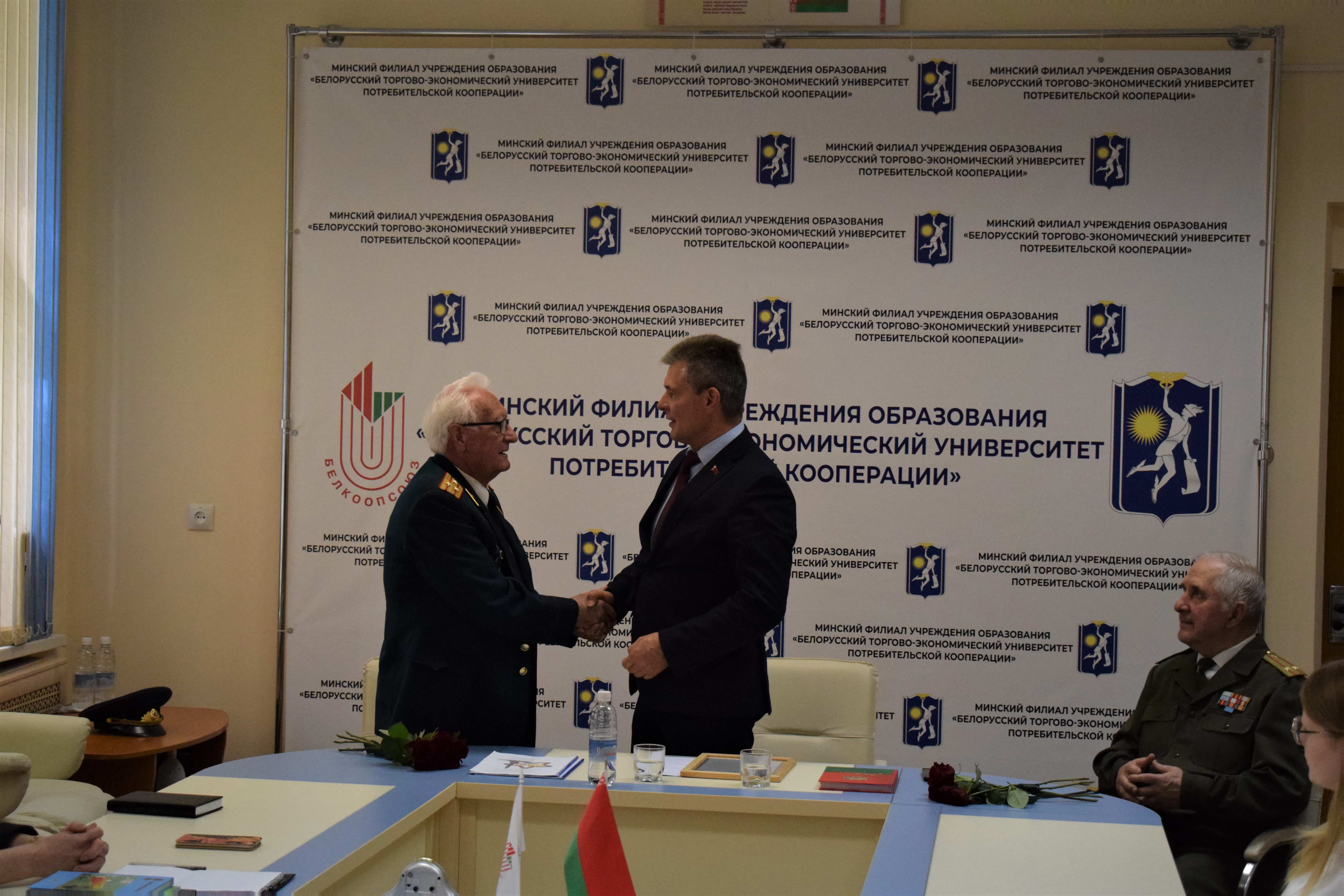 Директор филиала Левшунов Олег Федорович поблагодарил ветеранов Вооруженных Сил, отметив, что граждане нашей страны вот уже 80 лет живут под мирным небом, и, от имени педагогического коллектива, вручил Константину Константиновичу Благодарность за активное участие в жизни учреждения образования, бережное отношение к традициям и защите исторической памяти.