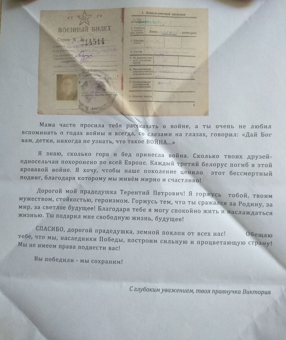 В предварительном этапе приняли участие все желающие. Задание было написать письмо прадеду или прабабушке, которые были участниками Великой Отечественной войны, либо тружениками тыла. Послание могло быть в форме письма-благодарности, сочинения-размышления о значении подвига, вложенного труда конкретного человека в победу советского народа в войне и в последующее послевоенное восстановление страны. В результате на республиканский этап конкурса отправлены письма: прадеду Харловскому Семену Иосифовичу учащейся 11 ЛБ группы Харловской Виктории; прадеду Расковинскому Цезарю Сильвестровичу, Герою Советского Союза, учащейся 12 ПБ группы Сафоновой Виалеты; прадеду Ходюкову Терентию Петровичу учащейся 11 ТБ группы Фиранчук Виктории.